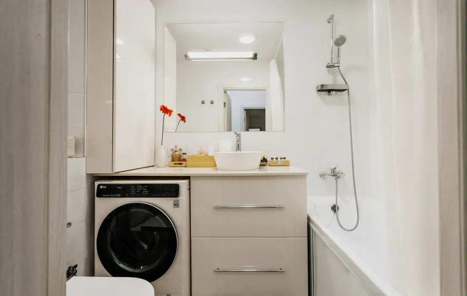 - Опрятная ванная комната с блестящими кранами и мягкими полотенцами, гигиеническими и косметическими наборами. Дополнительно присутствуют фен, утюг, сушилка.