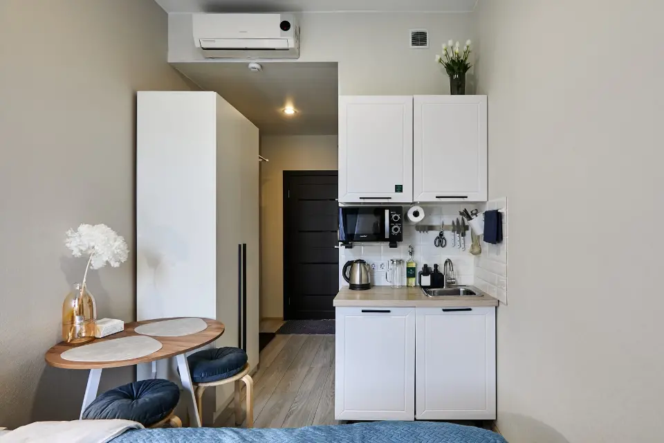 - Хорошо укомплектованная кухня, чайник, микроволновая печь, холодильник, индукционная плита, посуда и столовые приборы, обеденный стол и табуреты с мягкими сиденьями.