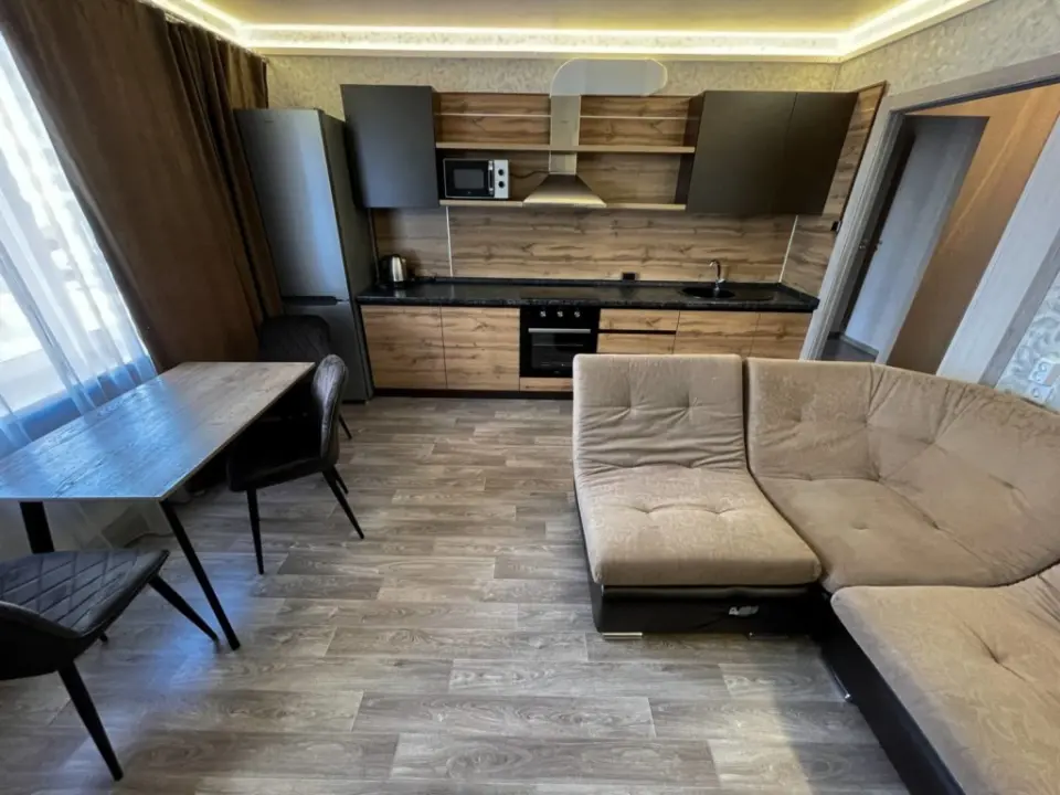 Двухкомнатная уютная квартира, большая двуспальная кровать, диван, тумбы, микроволновая печь, ЖК телевизор, кухонный гарнитур, плита, стиральная машина Вся необходимая посуда, столовые приборы.