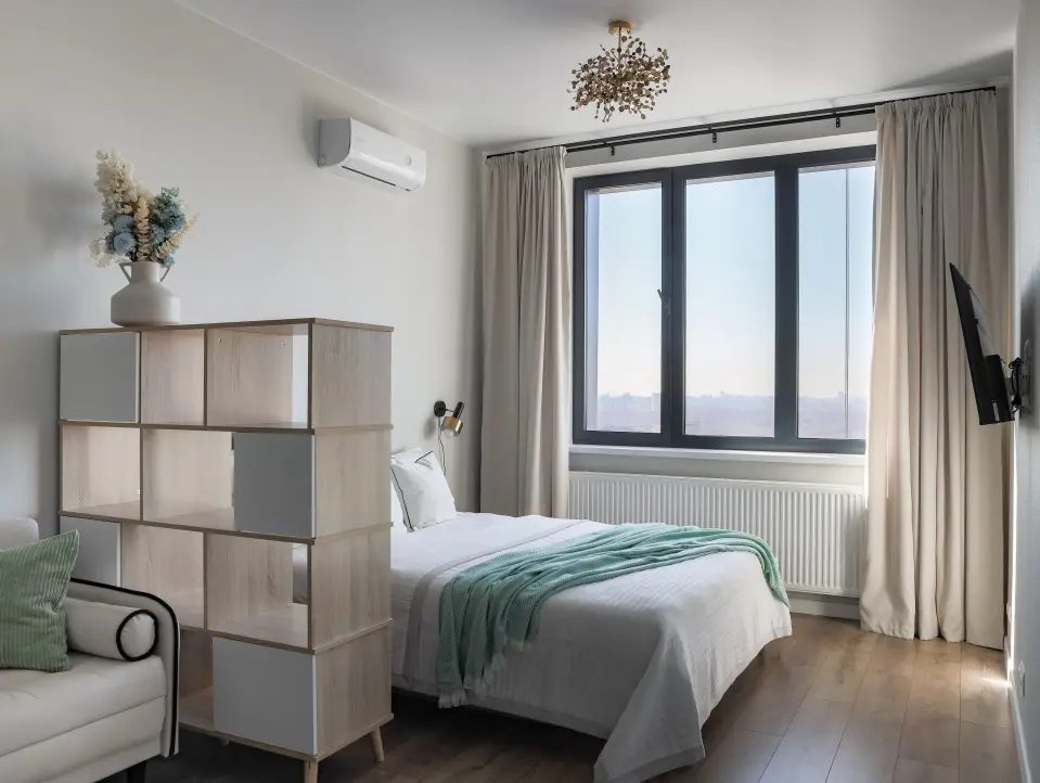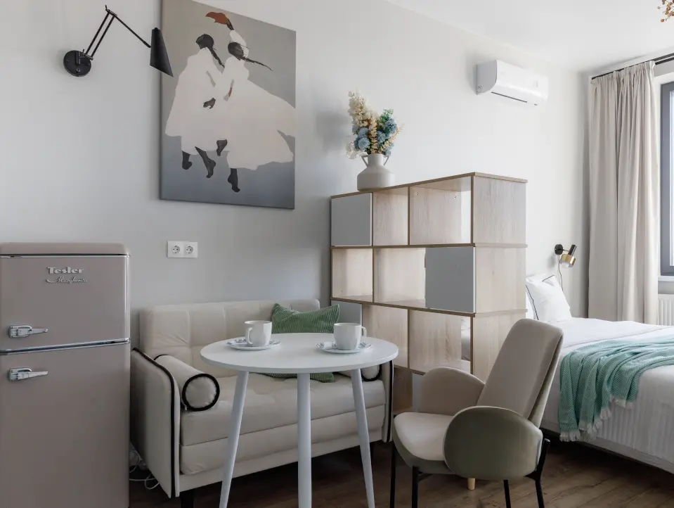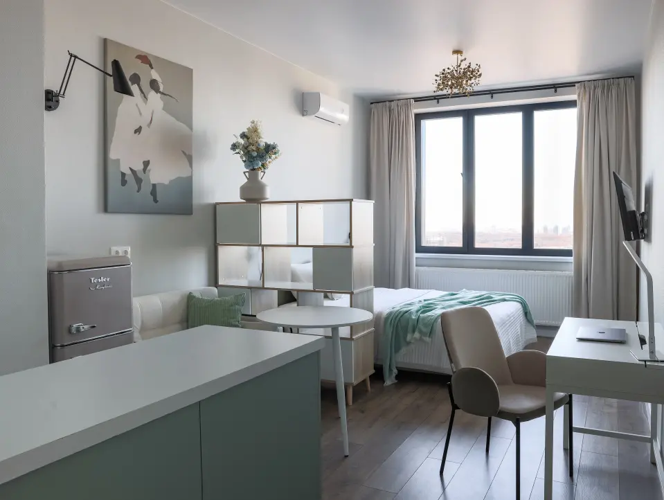 Современная студия для 3х гостей в ЖК Afi tower — идеальна как для семейного отдыха, так и для командировки.