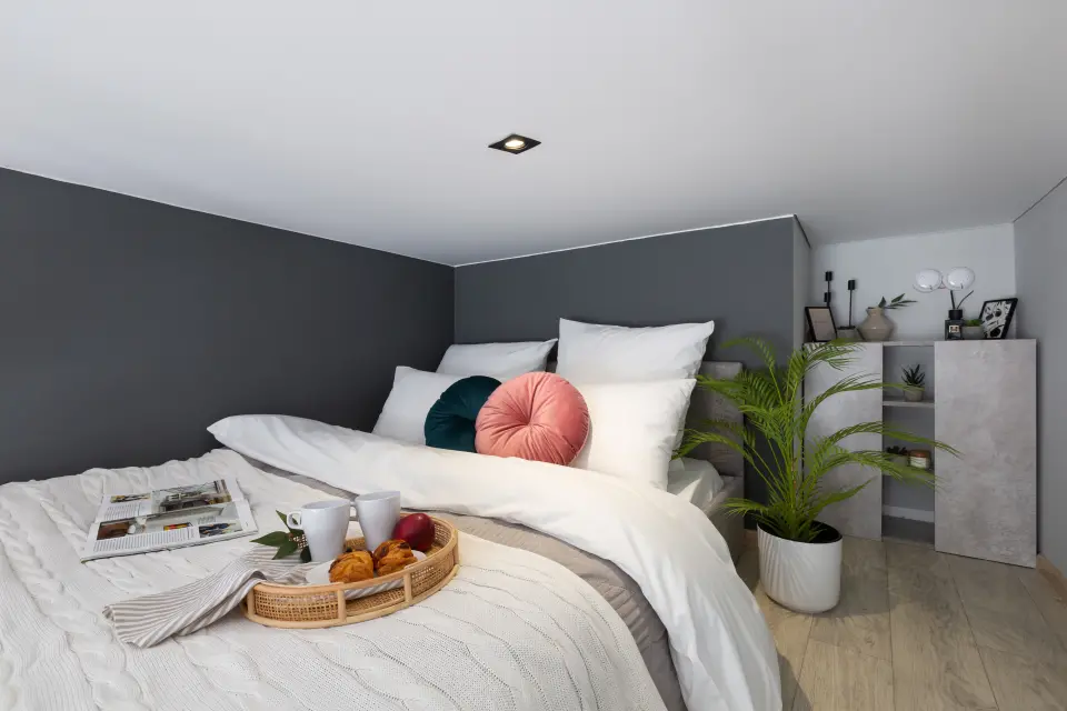 • Двуспальная кровать 140*200 на антресольном этаже (2 спальных места);