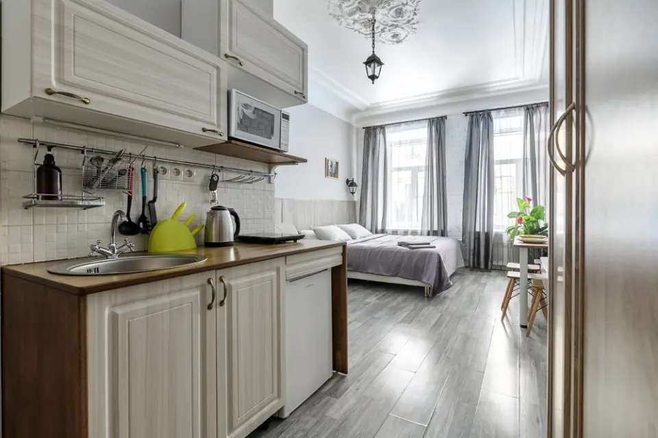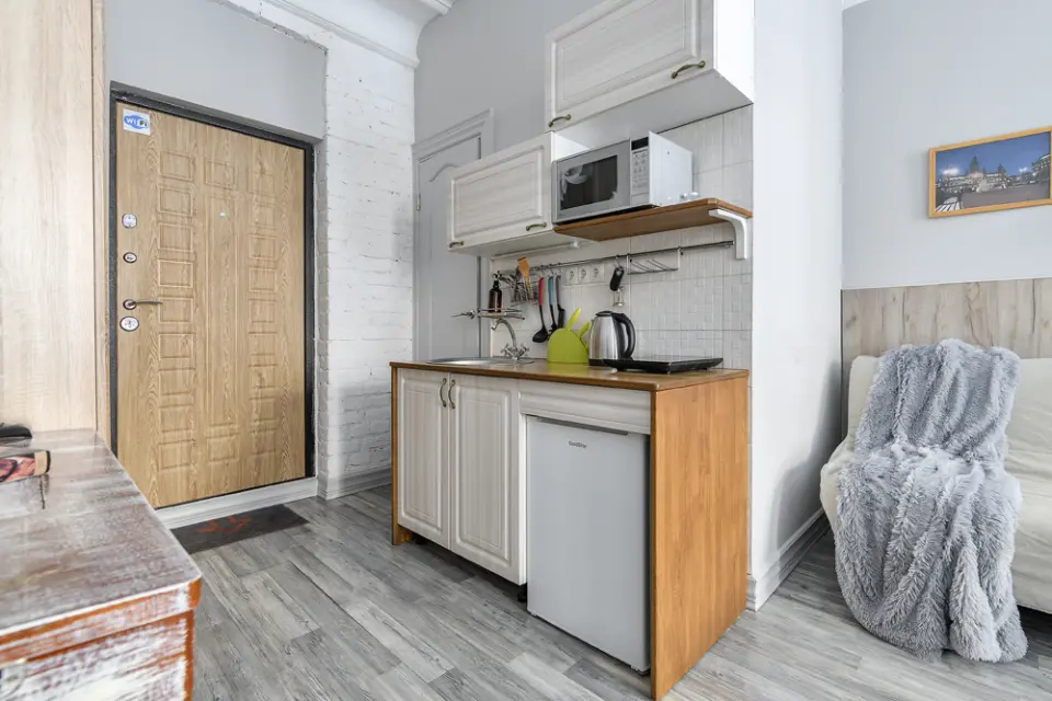 Студия с современным и практичным ремонтом для 4 гостей. В квартире одним из дизайнерских решений было применение материалов из благородного дерева при создании кухонного гарнитура и мебели, также в студии используются авторские handmade решения, которые не оставят наших гостей равнодушными.