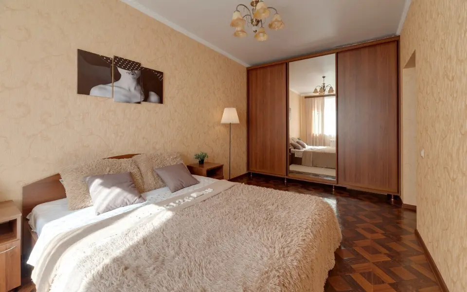 Всегда идеальная чистота. Постельное белье и полотенца после прачечной. Стиралка, микроволновка, чайник, гладилка, утюг, кондиционер. Музыка в душевой кабине. Вся посуда, кастрюли, сковородки, всё есть. 2-х спальная кровать. + Двухспальный раскладной диван на кухне-гостиной. Большой зеркальный шкаф-купе.