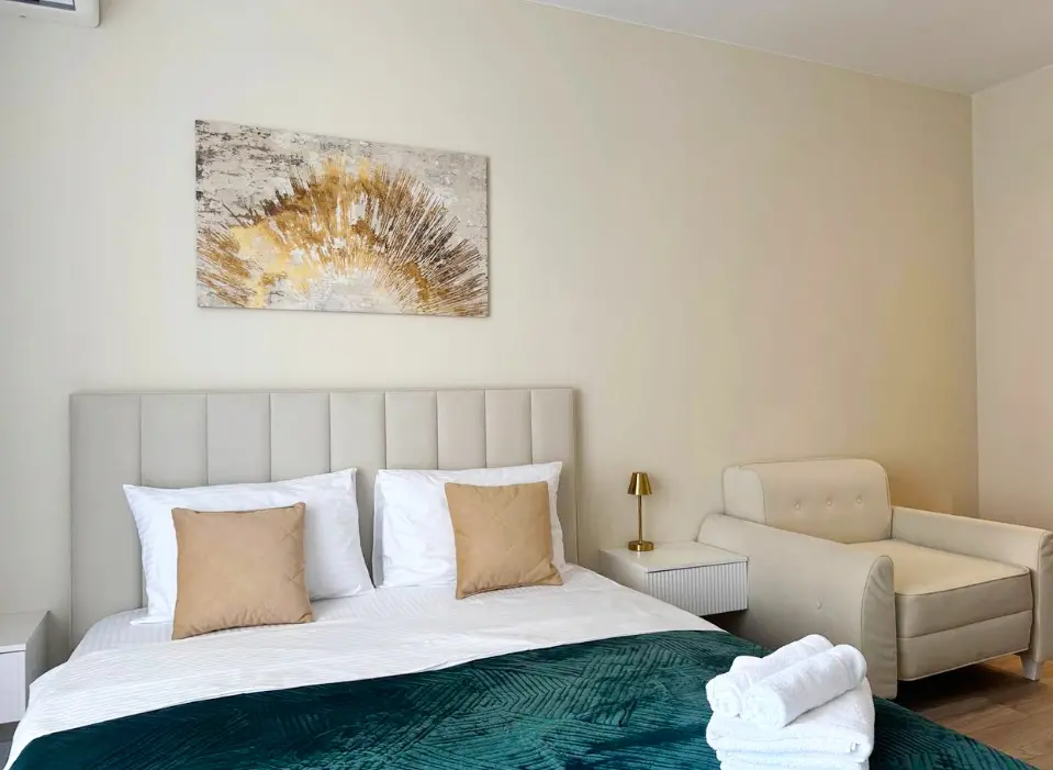- Размещение до 3 человек: удобная двуспальная кровать + кресло-кровать