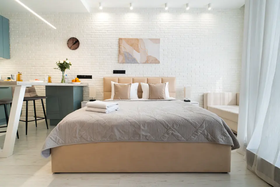Студия под названием Tenderess, площадью 32 м², расположенная на 4-м этаже в ЖК Лайнер, в 5-ти минутах от метро ЦСКА, рассчитана на размещение до 2-х гостей и оснащена одной двуспальной кроватью.