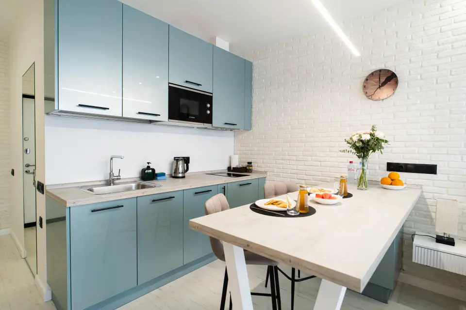- Стильная кухня в полной комплектации. Мини- бар позволит вкусно перекусить в перерыве между делами.