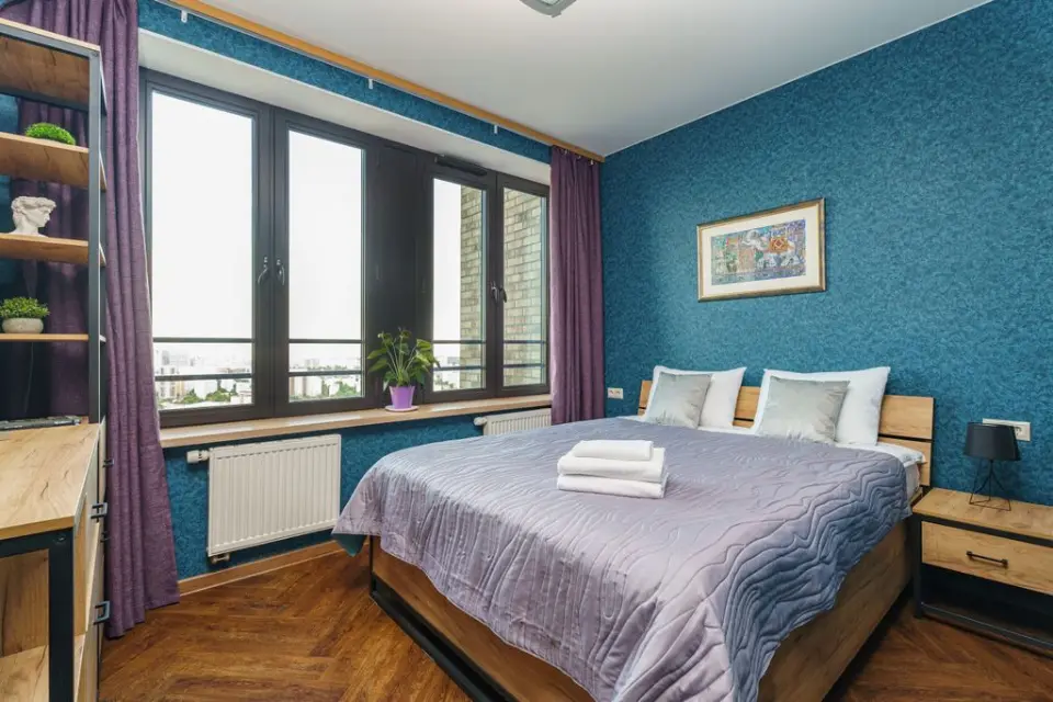 Стильная 3-комнатная квартира под названием Vintage House, площадью 65 м², расположенная на 35-м этаже в ЖК Савеловский Сити, в 10-ти минутах от метро Дмитровская, рассчитана на размещение до 5-х гостей и оснащена одной двуспальной кроватью, диваном-кроватью и диваном.