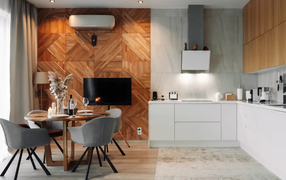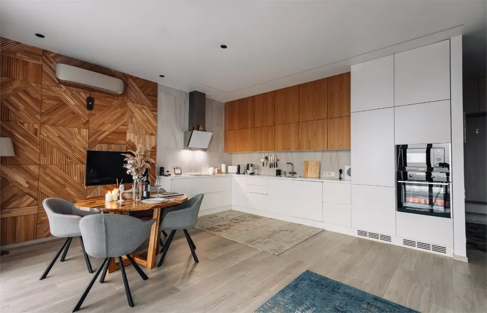 - Стильная кухня в полной комплектации, будто приглашает приготовить что-то вкусное и провести время за уютным ужином. Мини-бар позволит вкусно перекусить в перерыве между делами.
