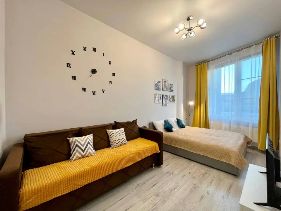 • Двуспальная кровать с ортопедическим матрасом застелена постельным бельем и диван для 1-2 гостей.