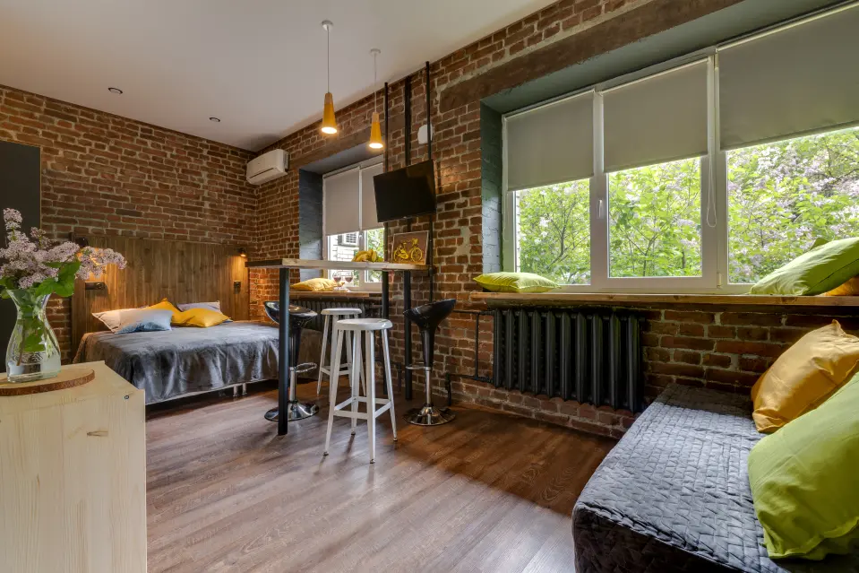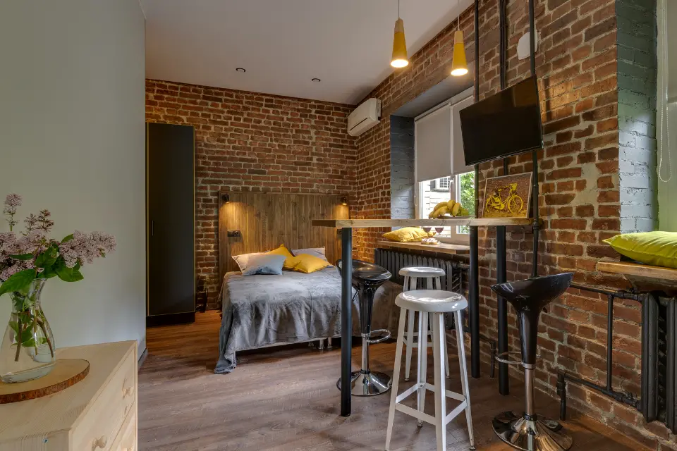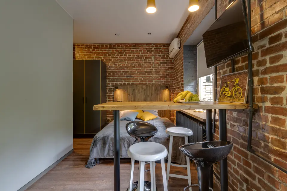 Четырехместная студия-делюкс в апарт-отеле на 11 номеров на набережной Макарова. Дизайн студий оформлен в стиле лофт, барная стойка и мини-кухня изготовлены с применением дерева ценных пород.