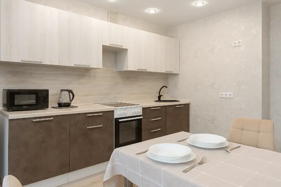 — Полностью оборудованная кухня: встроенная плита, микроволновая печь, холодильник, посуда, электрический чайник, обеденный стол и стулья;