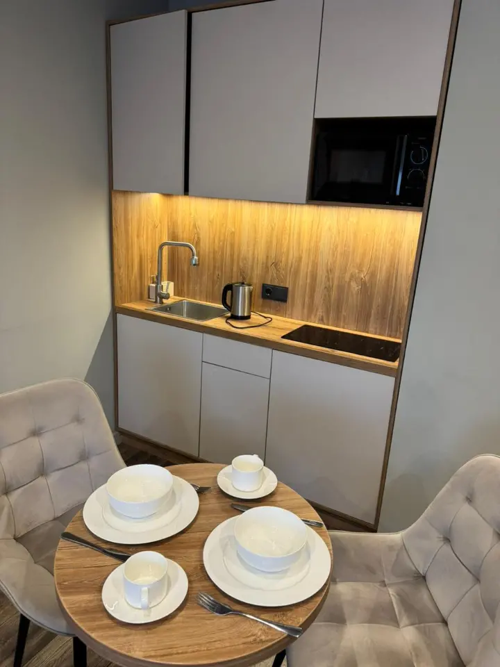 — Кухня оборудована всей необходимой бытовой техникой (варочная панель, холодильник, микроволновка) и посудой;