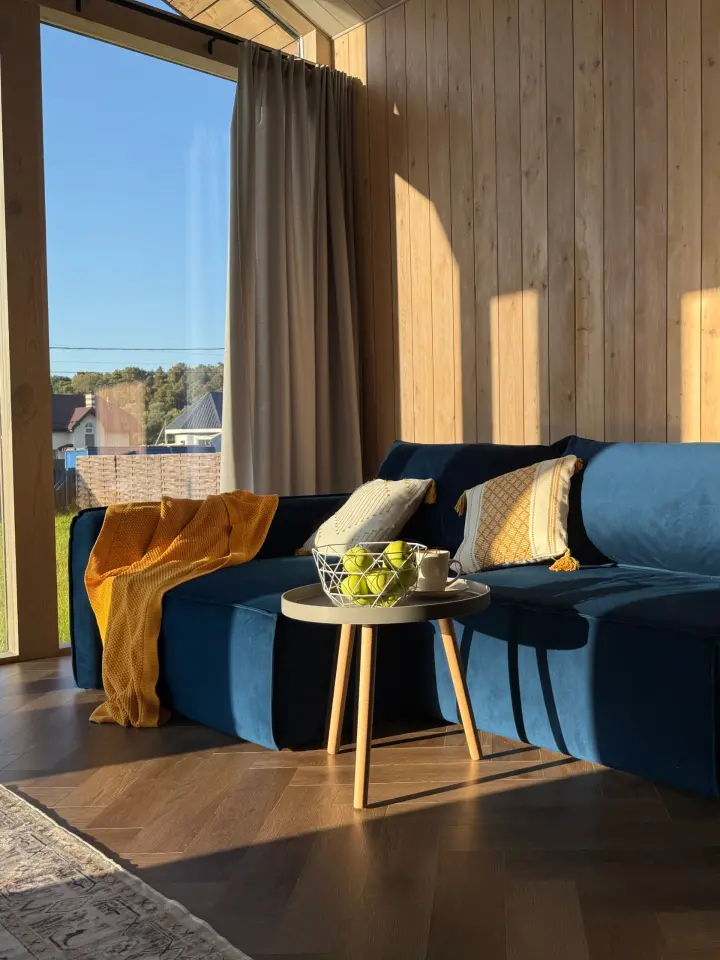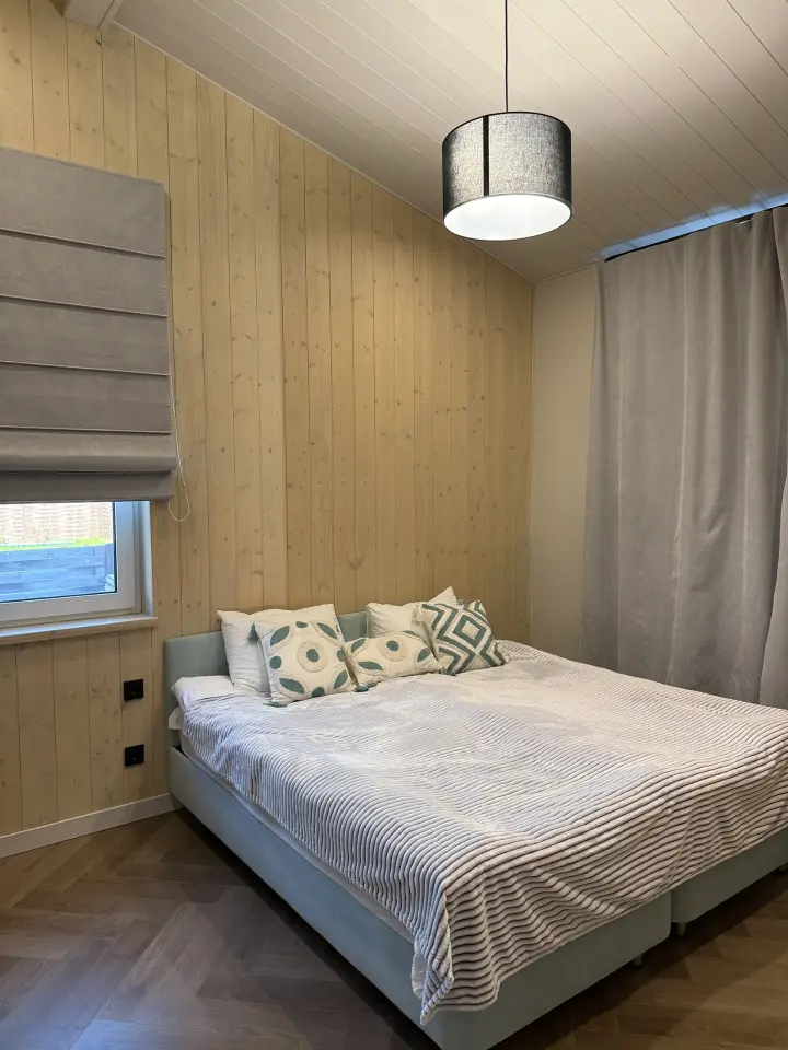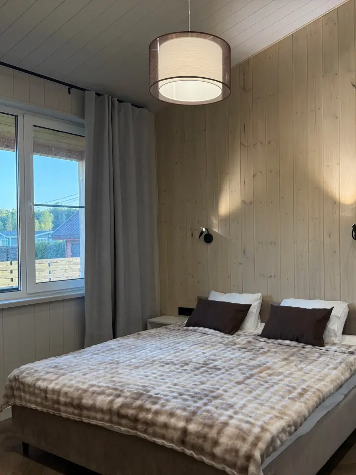 Внутри — три отдельные спальни, светлая гостиная, два санузла, продуманная планировка, где удобно быть вместе и при этом сохранять личное пространство. Большие окна наполняют дом светом, а из каждой комнаты чувствуется близость природы.