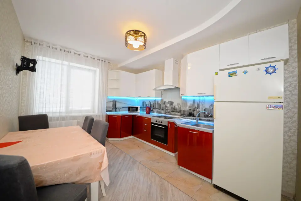 Просторная кухня оснащена всем необходимым для вашего комфортного проживания: удобный кухонный гарнитур, холодильник, индукционная плита с духовым шкафом, чайник, посуда, свч.