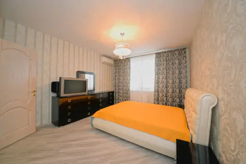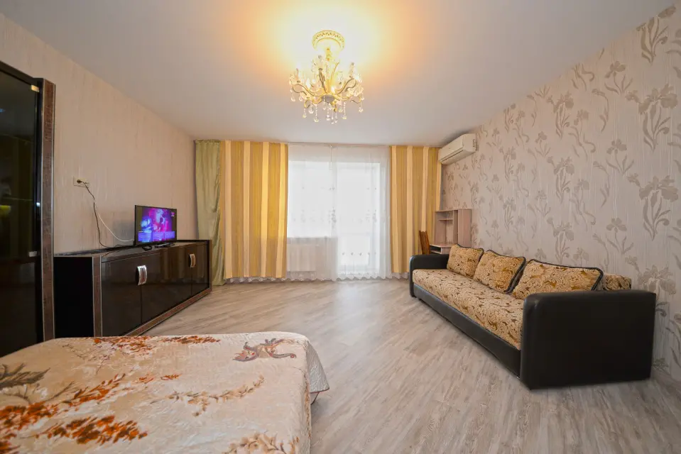 В квартире имеются две двуспальные кровати, двуспальный диван, рабочий стол, жк телевизор (подключено цифровое телевидение) и кондиционер, лоджия с панорамным видом на волгу.