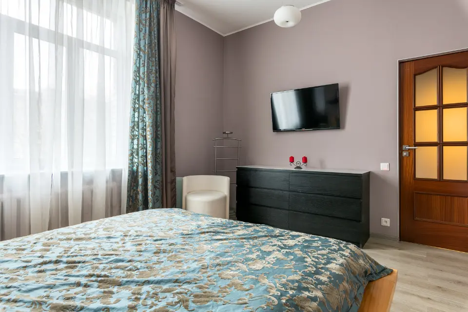 В квартире две изолированные комнаты с двуспальными кроватями, и просторная кухня с двуспальным раскладным диваном. В каждой комнате, включая кухню, установлен телевизор и подключено кабельное ТВ. На кухне есть балкон.
