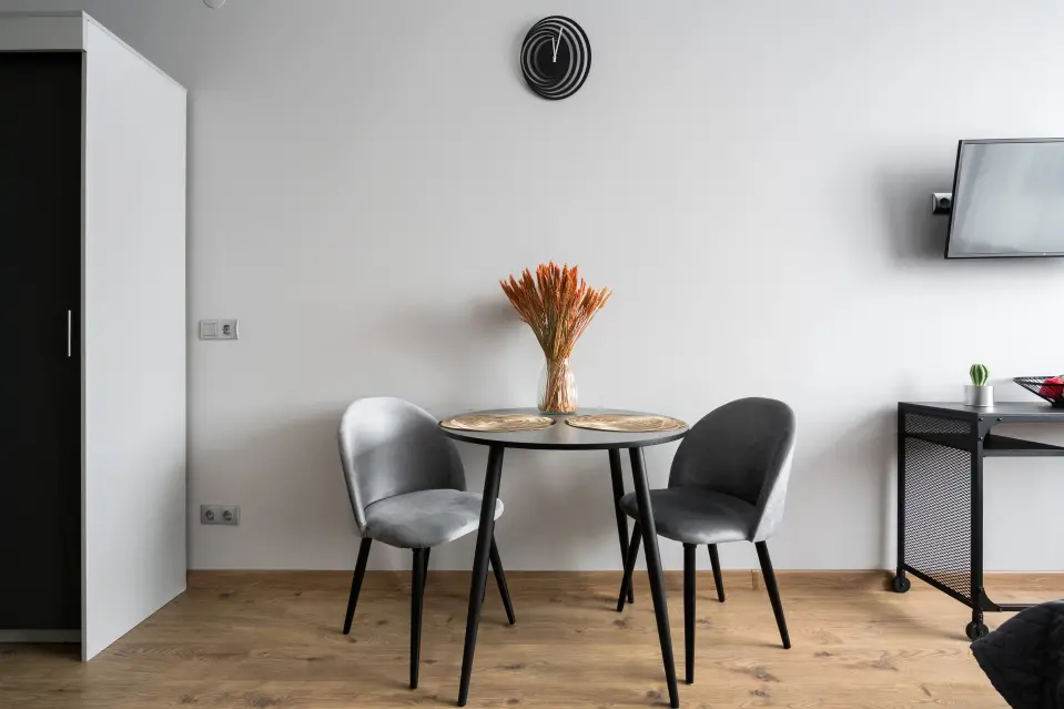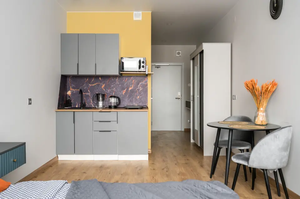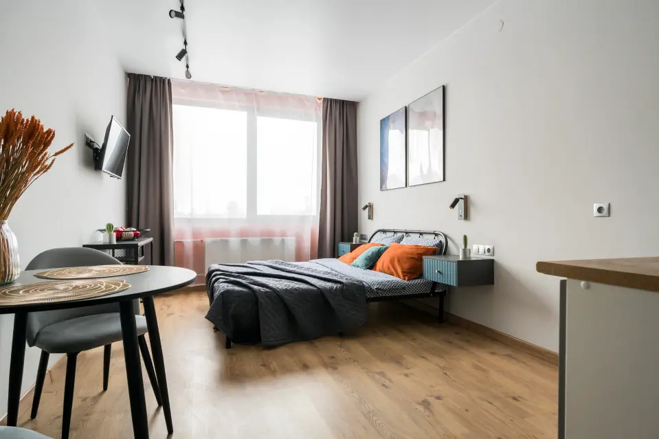 В студии есть все необходимое для комфортного проживания: в Зоне спальни: Двухспальная кровать 160*200(или две односпальных 80*200), прикроватные тумбы, телевизор со SmаtrТV. Полноценная кухня оснащена микроволновой печью, варочной панелью, холодильником и электрочайником, всей необходимой посудой и кухонной утварью, обеденным столом, стульями. Совмещенный санузел включает: душевую, туалет, стиральную машину, фен. К услугам гостей утюг, гладильная доска, бесплатный WI-Fi. В лобби на 1 этаже стильная зона коворкинга, круглосуточный пункт охраны, бесплатная парковка на территории отеля.