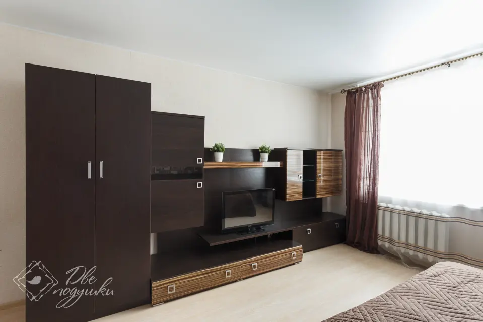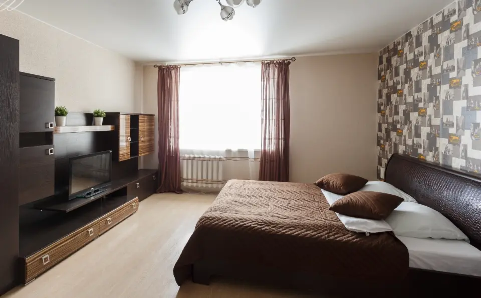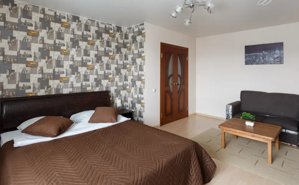 Эта квартира предлагает комфортное размещение с современным интерьером. Просторная спальня с большой двуспальной кроватью оформлена в теплых коричневых тонах, что создает атмосферу уюта и спокойствия. В зоне отдыха располагается удобный диван и журнальный столик, что позволяет расслабиться после насыщенного дня. На стенах интересные обои с городскими мотивами, добавляющие динамики в пространство. В гостиной предусмотрены телевизор и вместительный шкаф для хранения вещей.