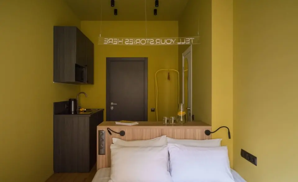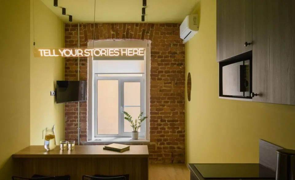 Оптимальная комплектация для комфортного проживания: собственная кухня, высокоскоростной WI-FI, Smart TV, кровать с ортопедическим матрасом. Студия располагается на втором этаже в составе шести апартаментов и оснащена кухней со всем необходимым для приготовления еды, холодильником с морозильной камерой. В ванной комнате: душевая, комплекты полотенец, зубные / бритвенные наборы, гель для душа и шампунь. Предоставляем тапочки и организовываем ежедневную уборку бесплатно.