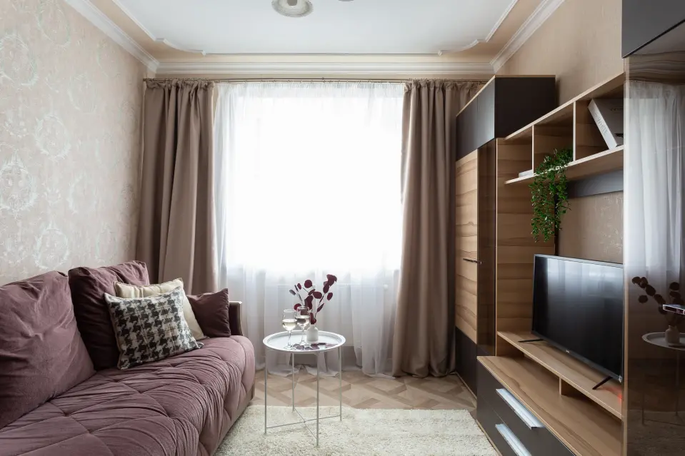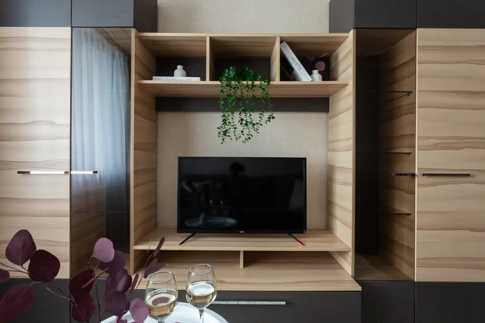Большое окно обеспечивает естественное освещение, а телевизор и вместительная стенка создают уютную атмосферу для отдыха.