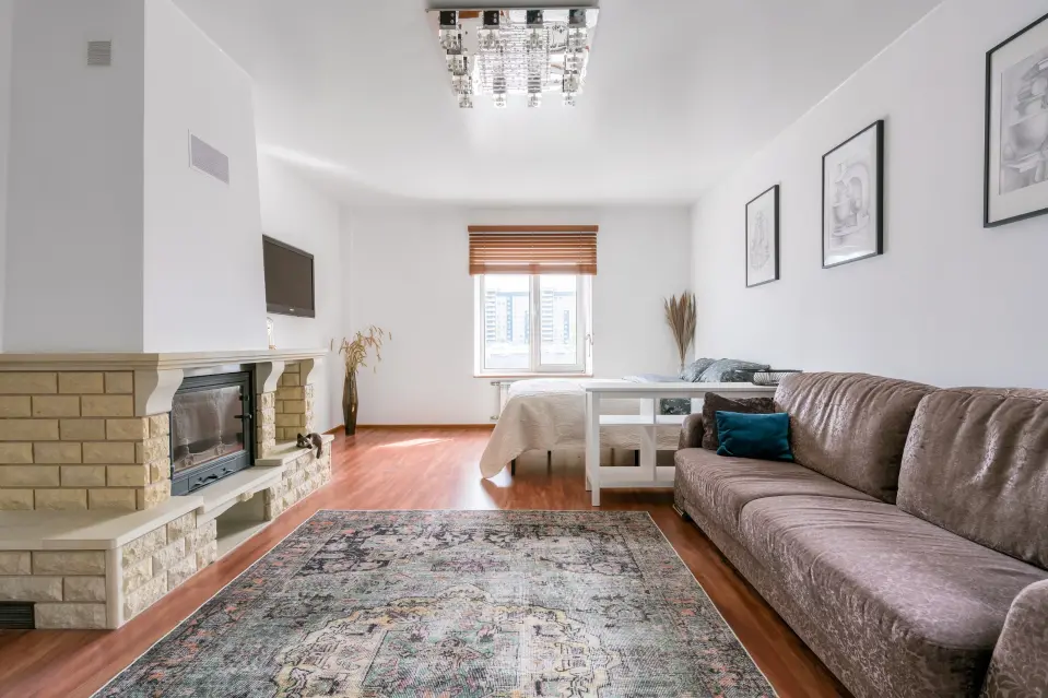В квартире есть все необходимое для комфортного проживания: 1 уютная спальня с двуспальной кроватью, вместительным шкафом; вторая спальня-гостиная с кроватью и раскладным диваном, ЖК-телевизором; декоративным камином; балконом с зоной отдыха; кухня, оборудована всем необходимым: кухонный гарнитур, холодильник, кухонная утварь, свч, электрическая плита с духовкой и вытяжкой, стиральная машинка, посудомоечная машинка; совмещенный санузел с ванной.