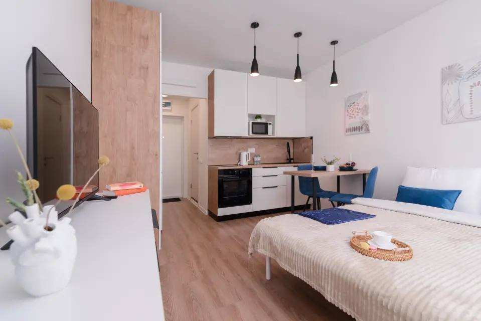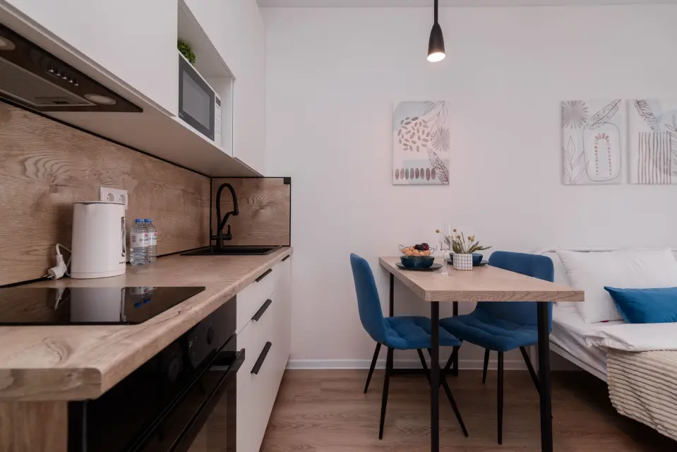 - Полноценная кухня (электроплита, холодильник, микроволновка, чайник)