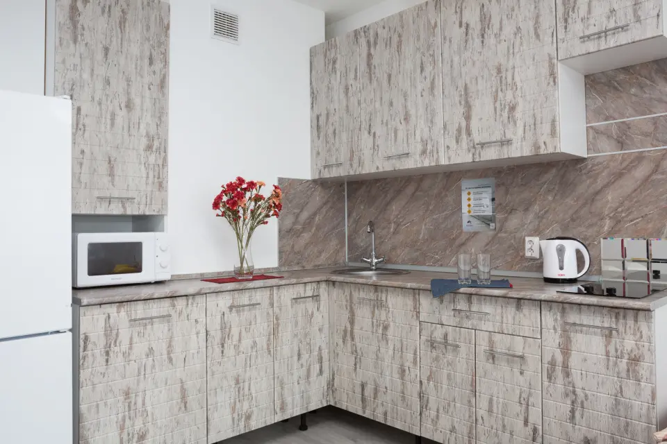 - Кухня оборудована всей необходимой бытовой техникой и посудой(плита, микроволновка, холодильник).