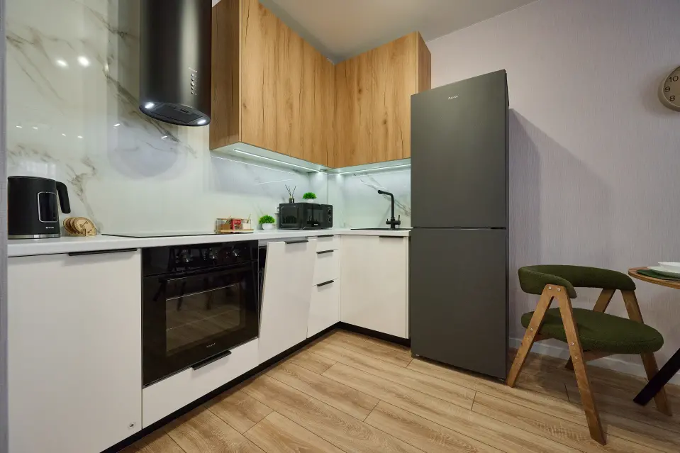 💚Полностью оборудованная кухня с холодильником, индукционной плитой, чайником, микроволновой печью, посудомоечной машиной и всей необходимой посудой