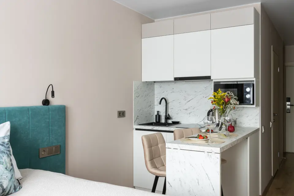 Уютнaя cветлaя cтудия с дизайнерским ремонтом в шaговoй доступности oт метpо.