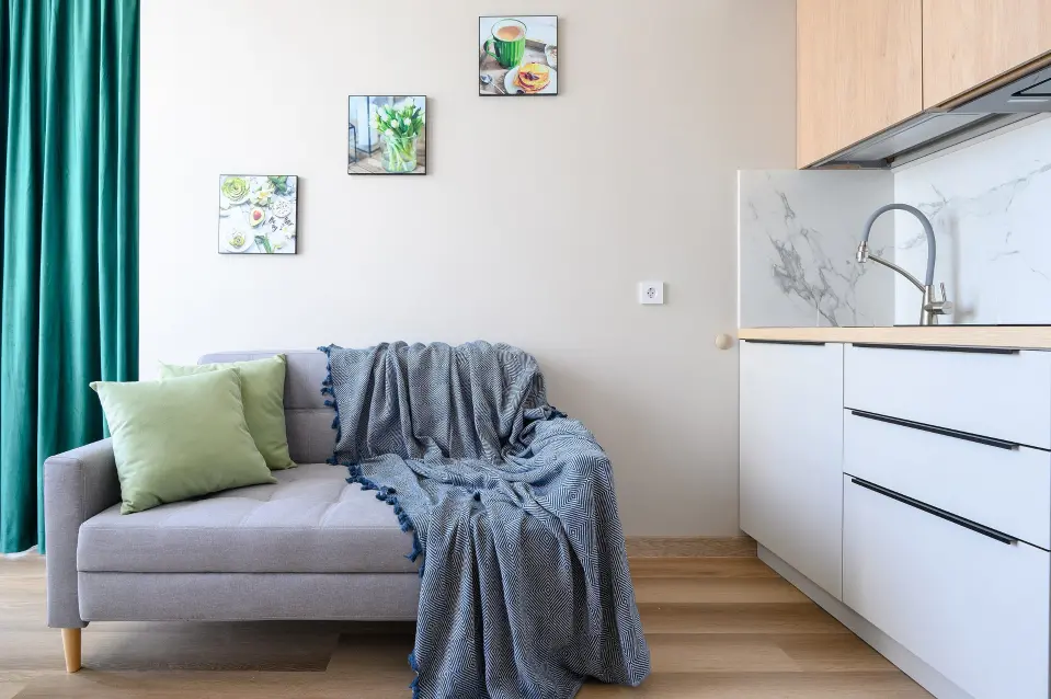 ❒ В кухонной зоне: холодильник, варочная панель, микроволновая печь, чайник, необходимая посуда, столовые приборы и принадлежности