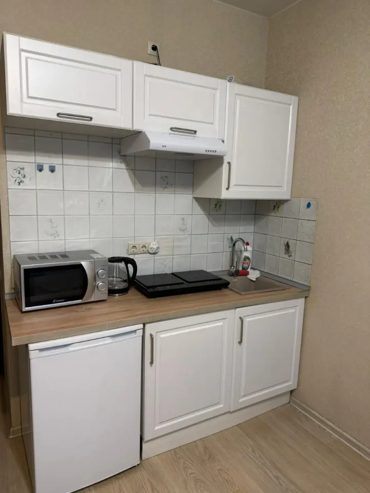 — Кухня оборудована всей необходимой бытовой техникой (индукционная плита, холодильник, микроволновка) и посудой;