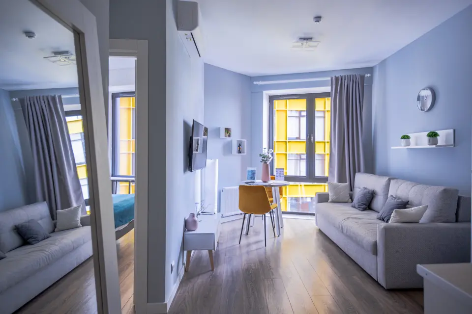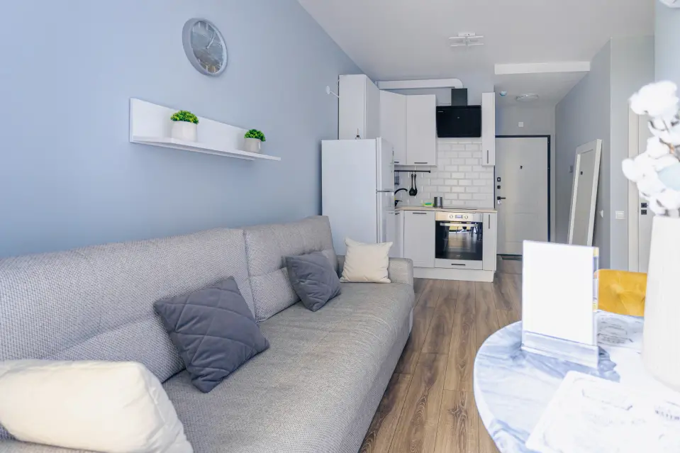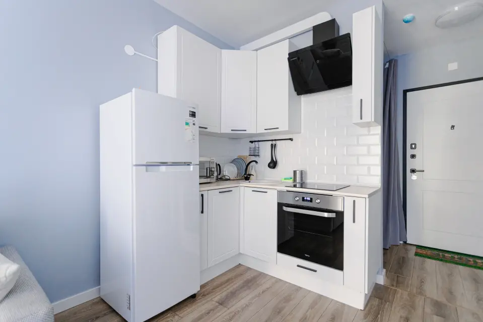 - Современная кухня в полной комплектации, радует минимализмом и эстетикой, а раскладной диван в гостиной делает квартиру универсальной. Минибар позволит вкусно перекусить в перерыве между делами.