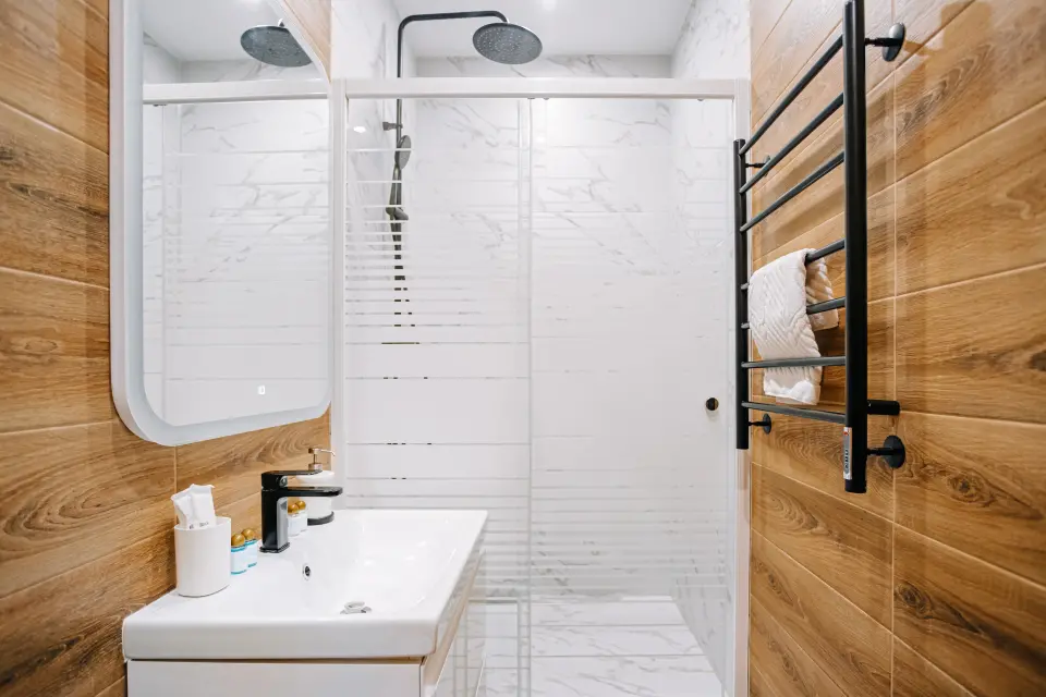 - Опрятная ванная комната с блестящими кранами и мягкими полотенцами, гигиеническими и косметическими наборами. Дополнительно присутствуют фен, утюг, сушилка.