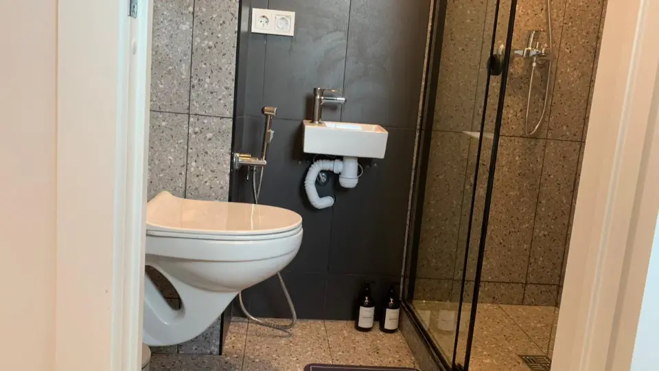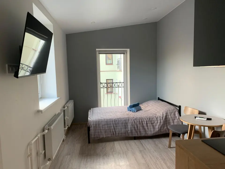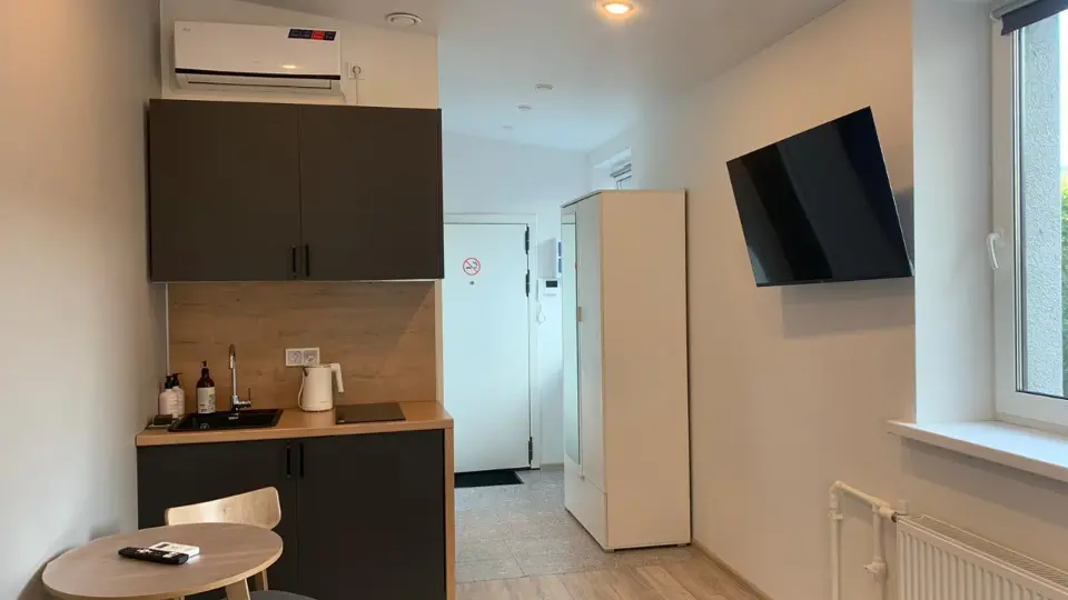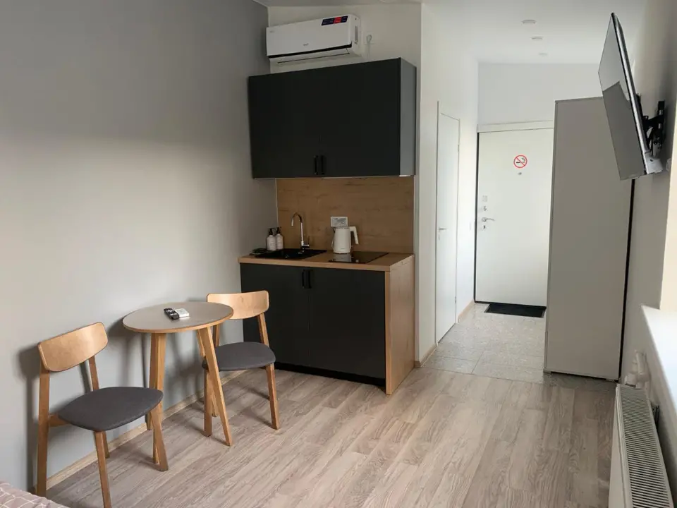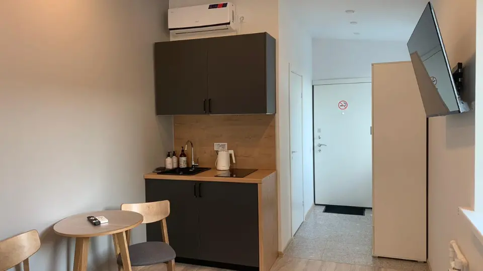 Вся необходимая мебель и техника: кровать 140*200, совмещенный санузел с душем, мини-кухня, кондиционер.