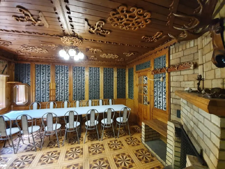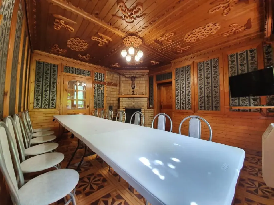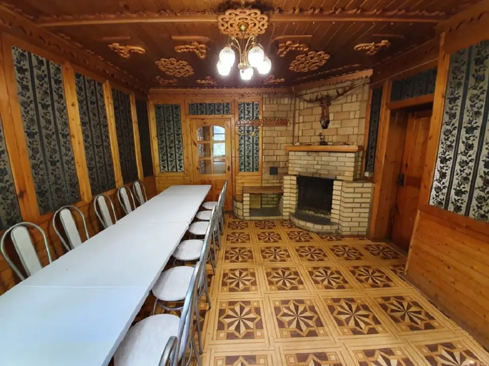 - 1 этаж: Банкетный зал, камин на дровах, два стола, 16 стульев, телевизор плазма. Небольшая комната с магнитофоном. Кухня, 2 сковородки, 3 кастрюли, доски для резки, салатники, куча поварёшек, штопоры, открывашки, ножи. Привозите свои одноразовые тарелки, столовые приборы, кружки и чашки.