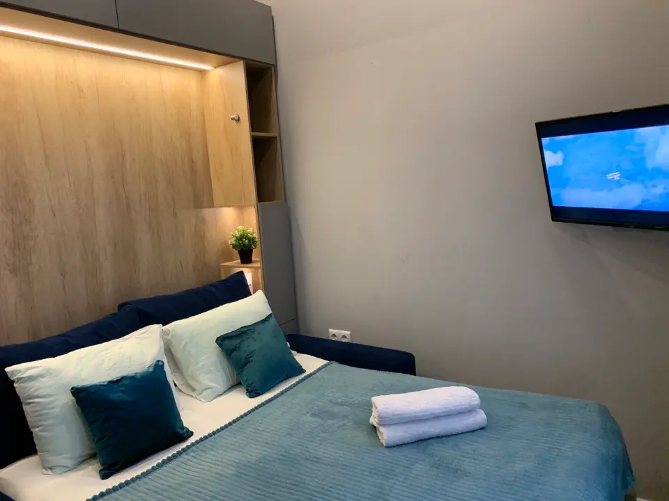 •Двуспальная кровать с ортопедическим матрасом превращается в диван для увеличения комфорта в студии.