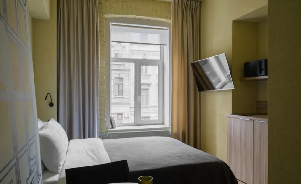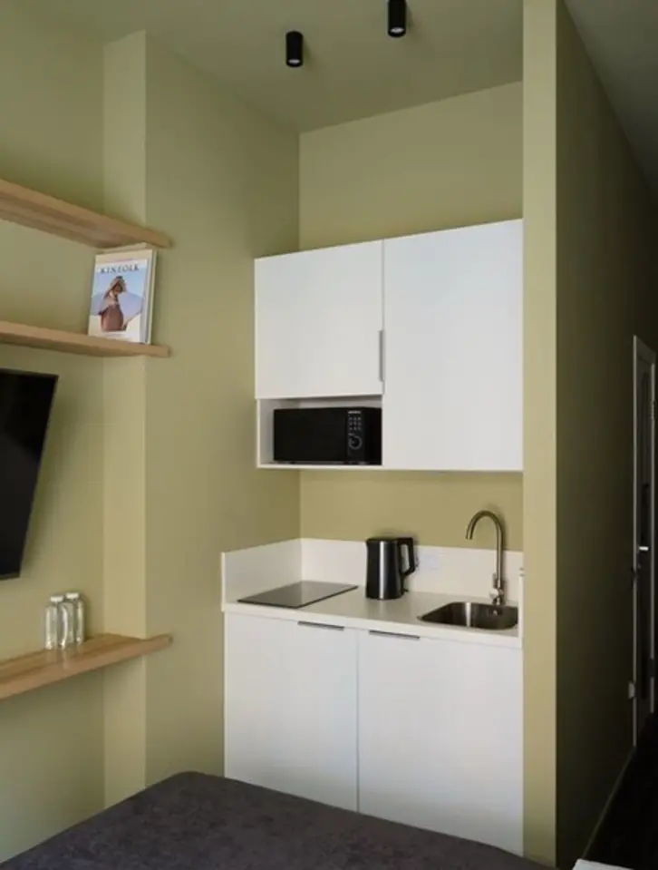 Оптимальная комплектация для комфортного проживания: собственная кухня, высокоскоростной WI-FI, Smart TV, кровать с ортопедическим матрасом. Студия располагается на втором этаже в составе шести апартаментов и оснащена кухней со всем необходимым для приготовления еды, холодильником с морозильной камерой. В ванной комнате: душевая, комплекты полотенец, зубные / бритвенные наборы, гель для душа и шампунь. Предоставляем тапочки и организовываем ежедневную уборку бесплатно.