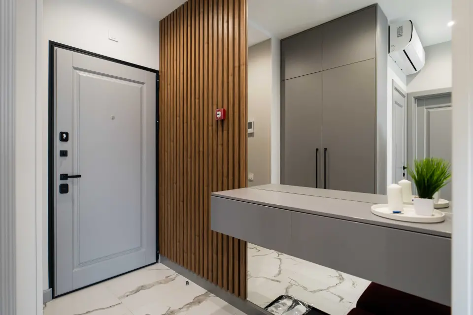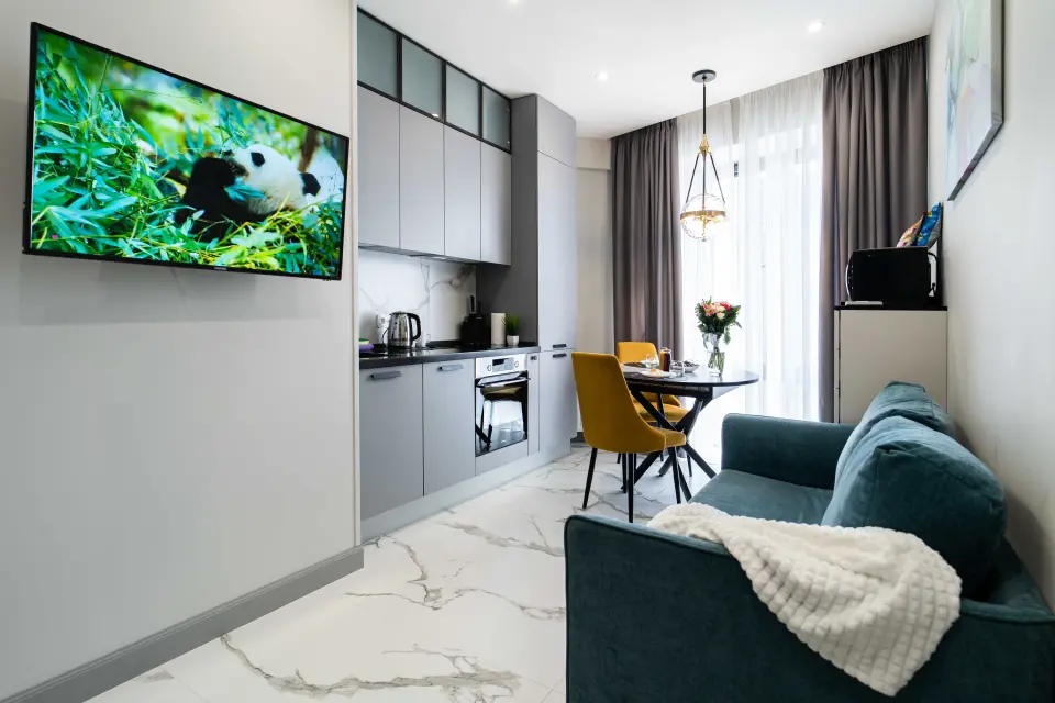 - Современная кухня в полной комплектации, в современных оттенках предлагает гармонию спокойствия и утилитарности, идеально подходящую для вдохновляющих утренних кофе или уютных вечеров за кулинарным творчеством. Мини-бар позволит вкусно перекусить в перерыве между делами.