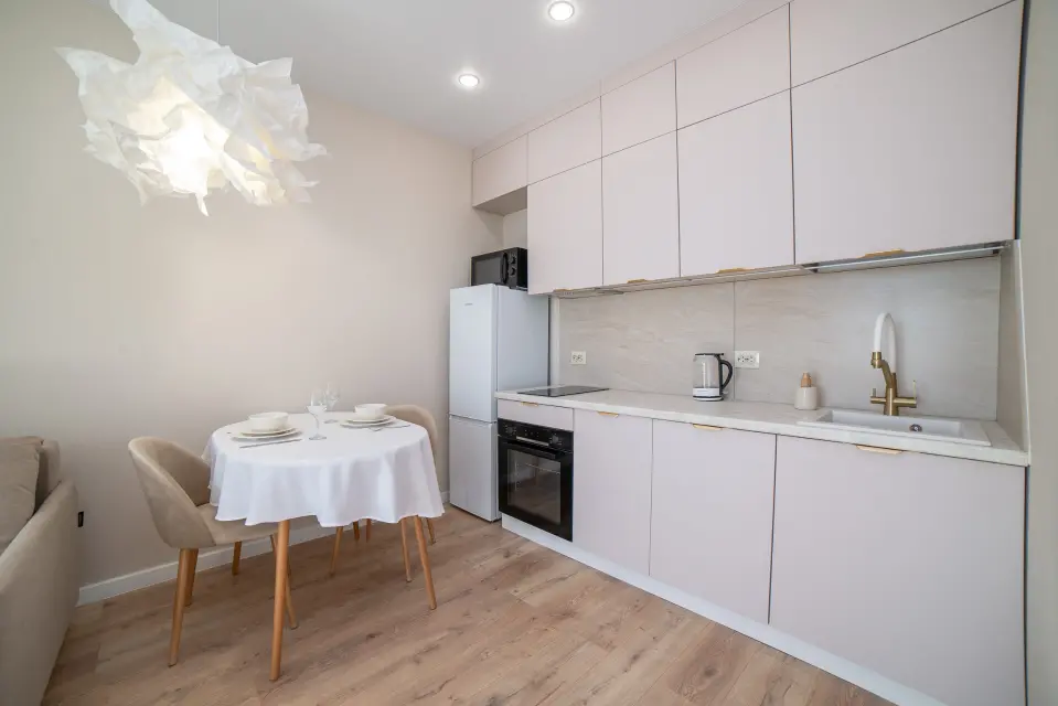 * Полноценная кухня (варочная панель, микроволновка, чайник, посудомоечная машина, духовка, кондиционер)