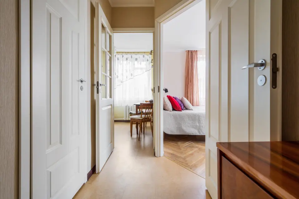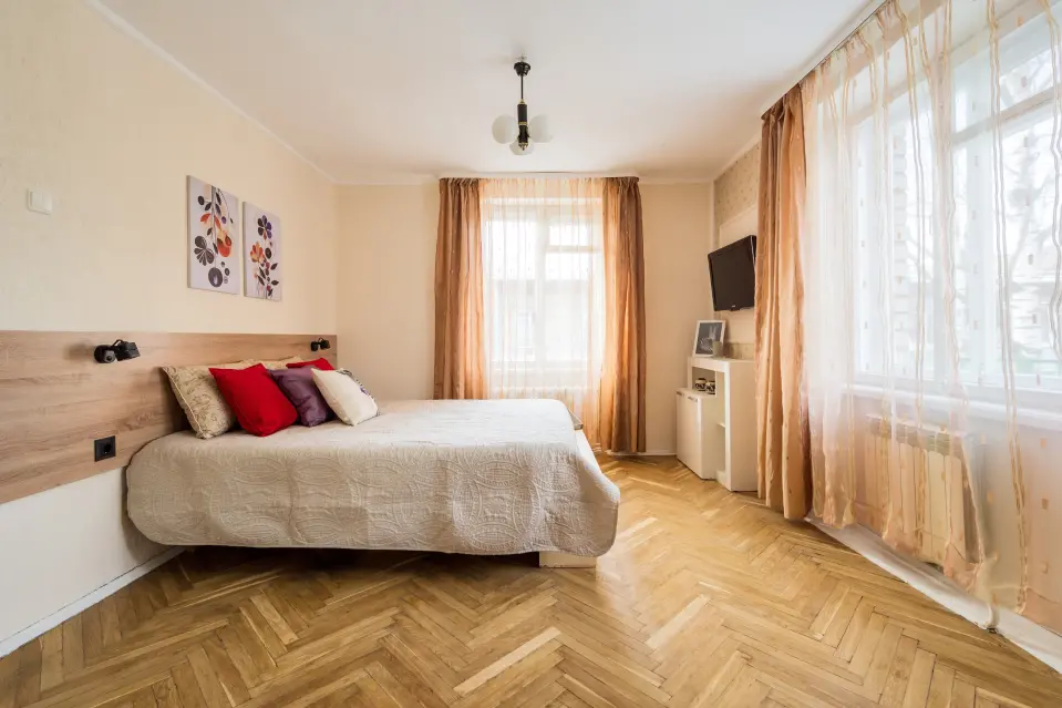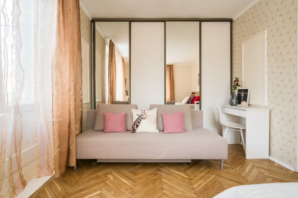 просторная спальня с кроватью и раскладным диваном, вместительный встроенный шкаф купе, письменный стол, тв, тумба. Небольшая кухня со всей необходимой мебелью, техникой и кухонной утварью. Совмещенный санузел с туалетом, ванной, старальной машиной.