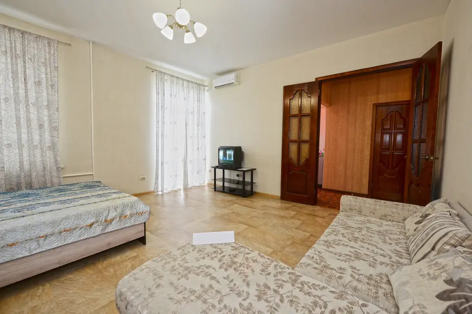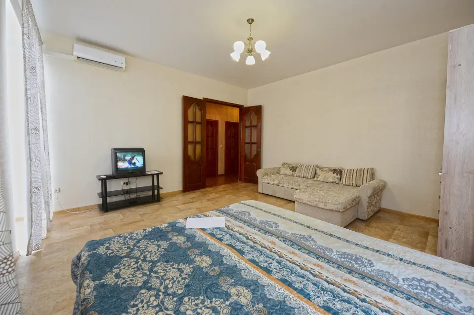 В комнате имеется удобная широкая двуспальная кровать, двуспальный диван, ЖК телевизор (подключено цифровое телевидение) и шкаф для хранения одежды!