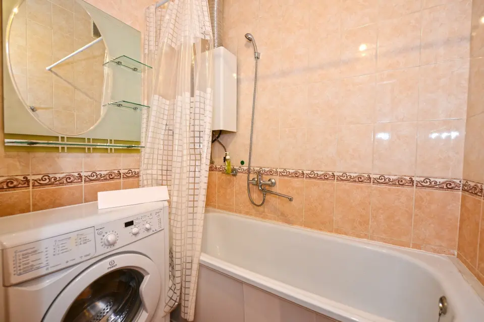 Кухня оснащена всем необходимым для Вашего комфортного проживания: удобный кухонный гарнитур, холодильник, газовая плита с духовым шкафом, чайник, СВЧ, также есть стиральная машина.