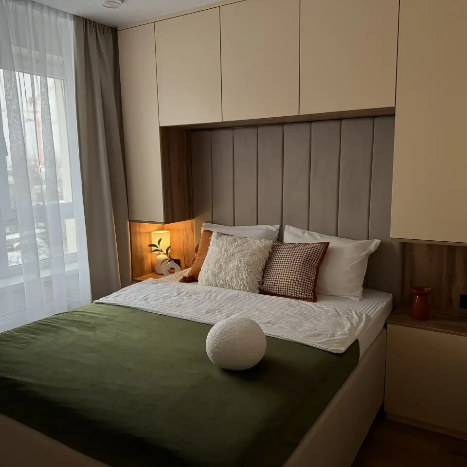 * Вместимость: до 4 гостей (двуспальная кровать и двуспальный диван)