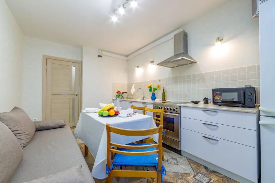 - Кухня оборудована всей необходимой бытовой техникой (плита, холодильник) и посудой