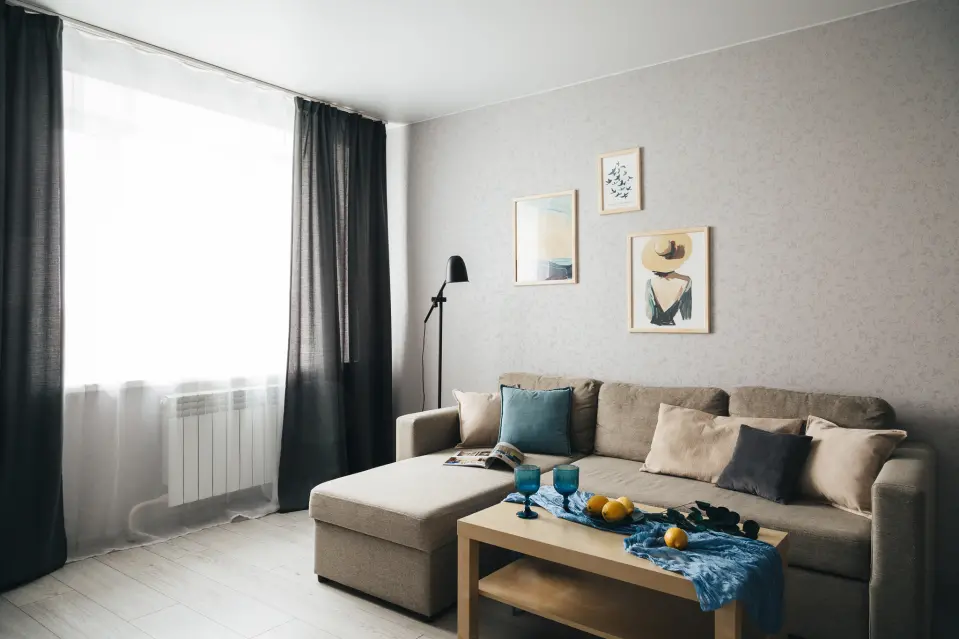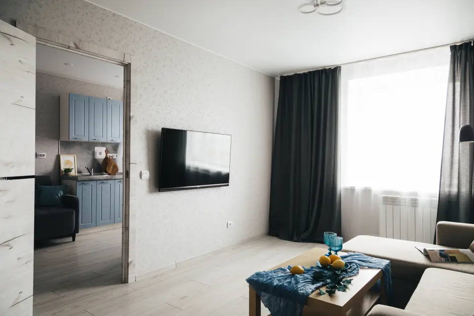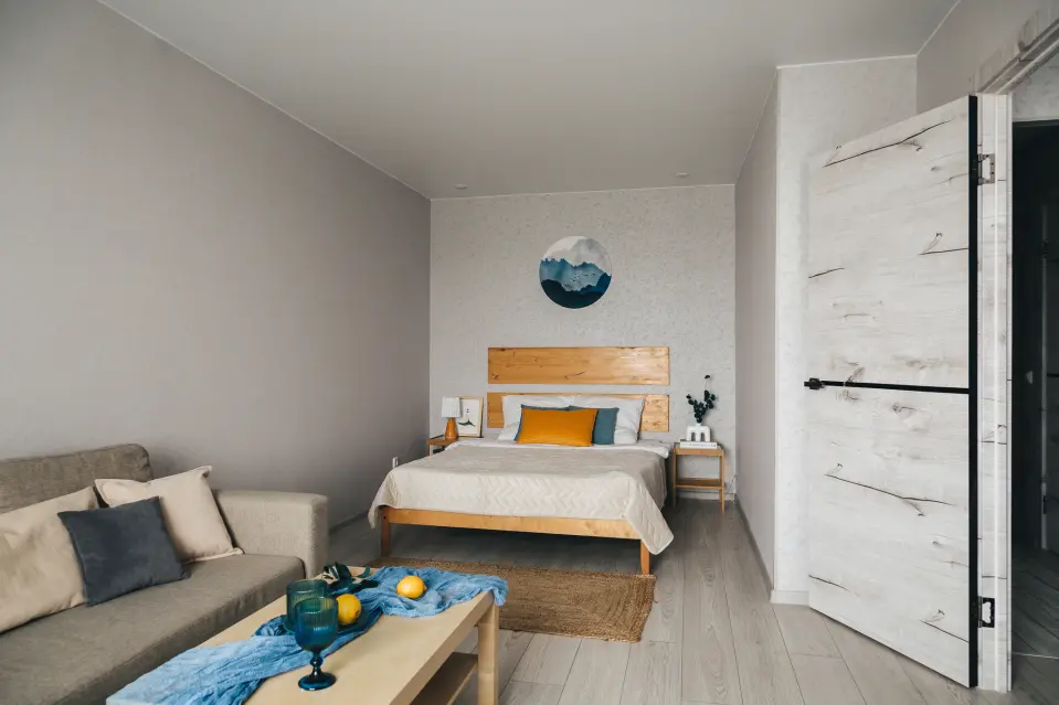 Эта уютная квартира оформлена в современном стиле с использованием мягких цветовых акцентов. Спальная зона расположена с удобной двуспальной кроватью, обеспечивая комфортный отдых. В гостиной части также имеется диван, который может служить дополнительным спальным местом.