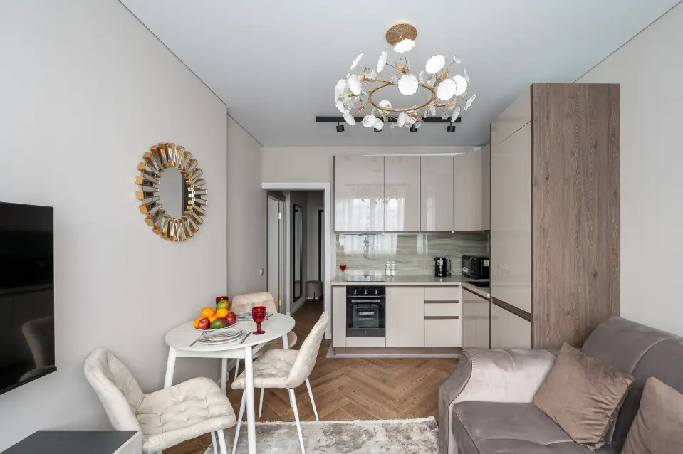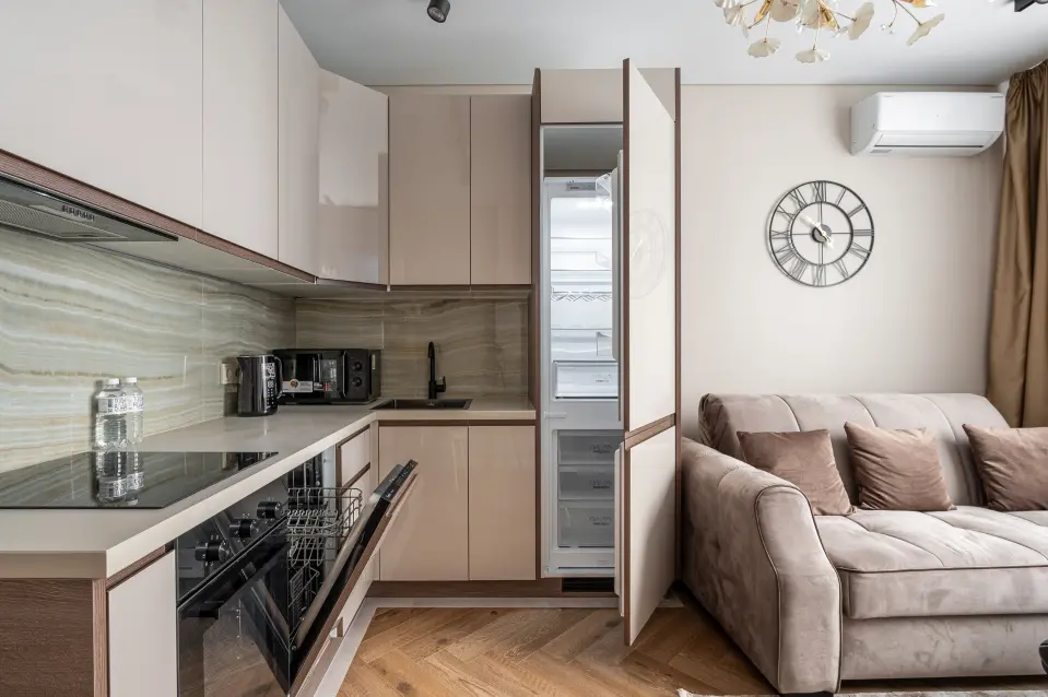 - Полностью укомплектованная кухня: холодильник, микроволновка, варочная панель, духовой шкаф, чайник, посудомоечная машина — всё для готовки