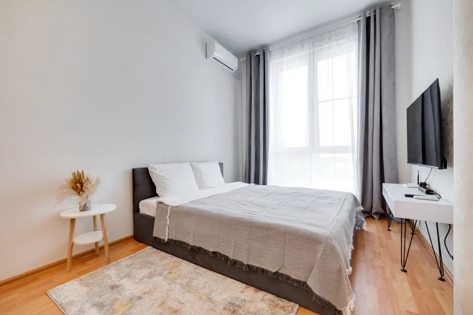• Двуспальная кровать с ортопедическим матрасом застелена постельным бельем для 2-х гостей.
