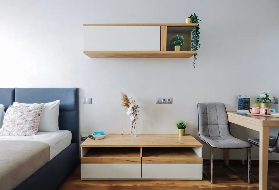 Дизайнерский интерьер сочетает в себе мягкие натуральные оттенки дерева и теплые акценты, создавая ощущение, будто вы перенеслись в современный домик среди заснеженных лесов. Элементы декора и текстиля напоминают уютное шале, где каждая деталь продумана для максимального комфорта.