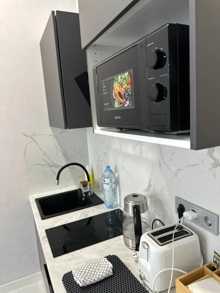 - Кухонный гарнитур со всей необходимой техникой и посудой