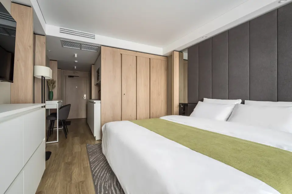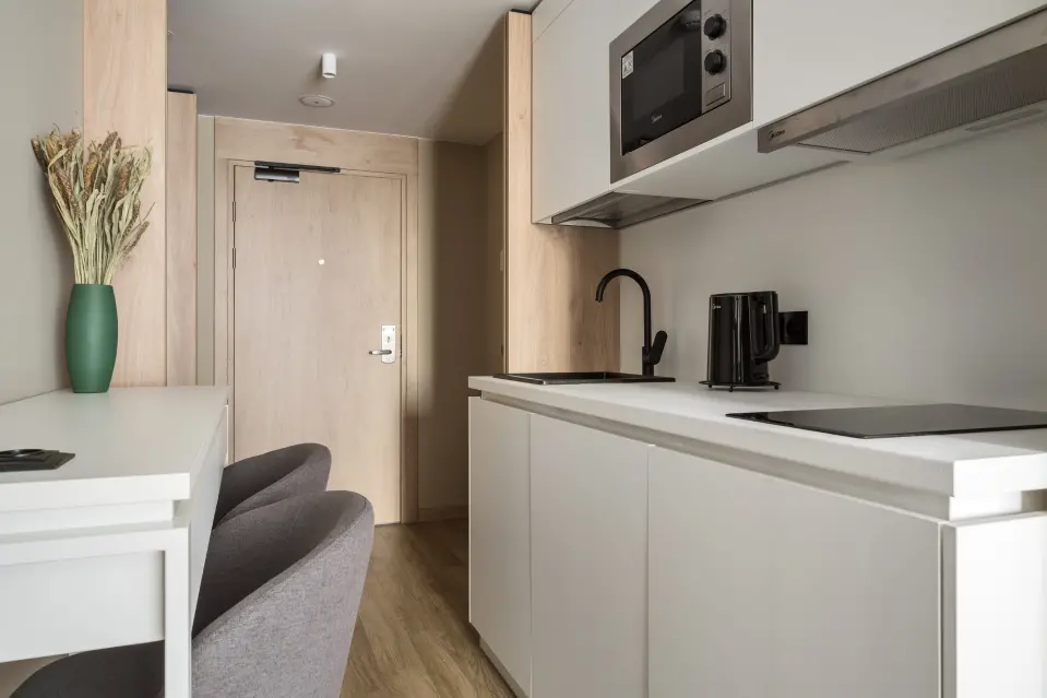 В студии есть всё для комфортного проживания: двуспальная кровать, ортопедический матрас для комфортного сна, всё необходимое для приготовления пищи, микроволновая печь, плита, постельное белье, полотенца, стиральная машина, утюг, гладильная доска, фен. Свежее постельное белье и полотенца предоставляются.